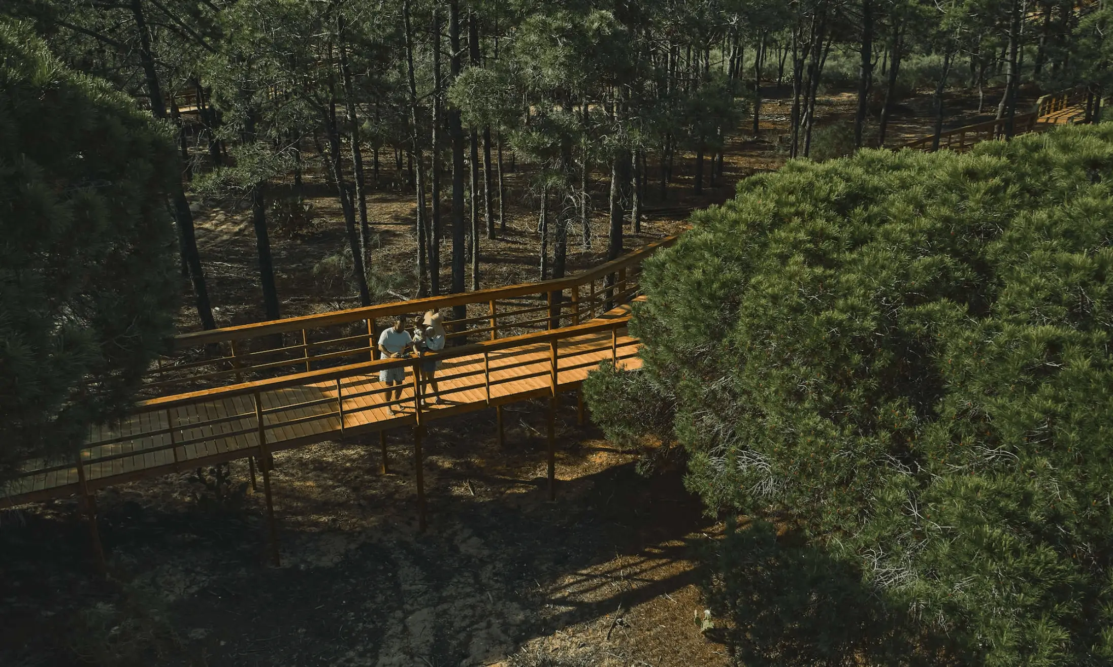 0,5 km y siete minutos completamente a través de una pasarela. Es un camino sinuoso que rodea los aún jóvenes pinos piñoneros que caracterizan este entorno costero. Sombras y claros nos acompañan, creando una dinámica de paisajes, sonidos y libertad, combinada con la constante presencia de la biodiversidad que habita la zona, incluidos los pinos marítimos, que se encuentran aquí de forma natural. La constante presencia de la naturaleza y las especies autóctonas se ve recompensada al final con la llegada a la costa.