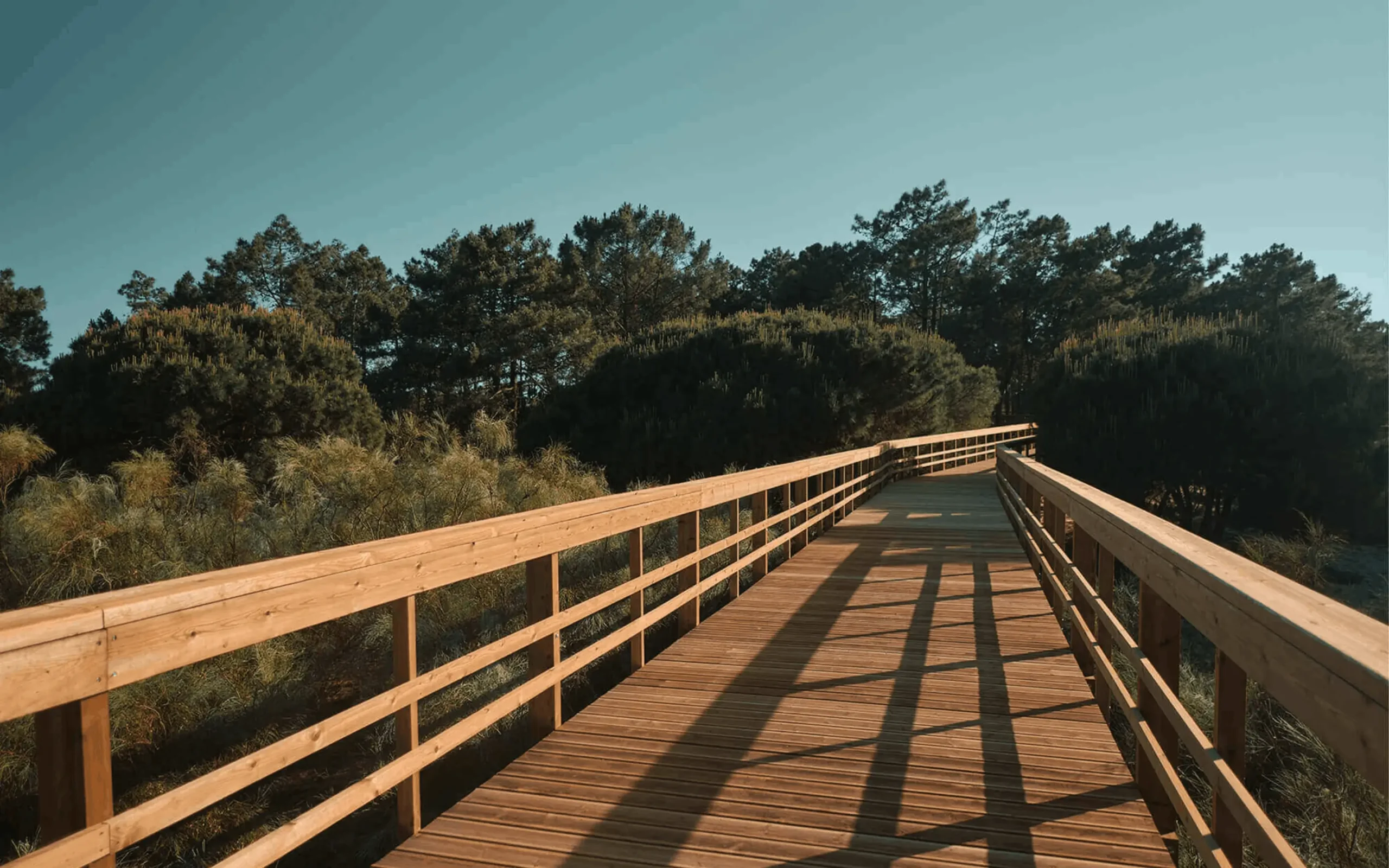 2,5 km y treinta y cinco minutos a pie, partiendo del complejo deportivo. Una laguna de 2 hectáreas se extiende sobre el paisaje que atravesamos, donde la fauna se guía por el ritmo de la naturaleza. Por encima del puente, o alrededor de él, el objetivo es llegar a la línea de flotación que une la laguna con el mar y dejar que la arena, salpicada de agujas de pino, llene nuestro camino para darnos la sensación de estar junto al mar.